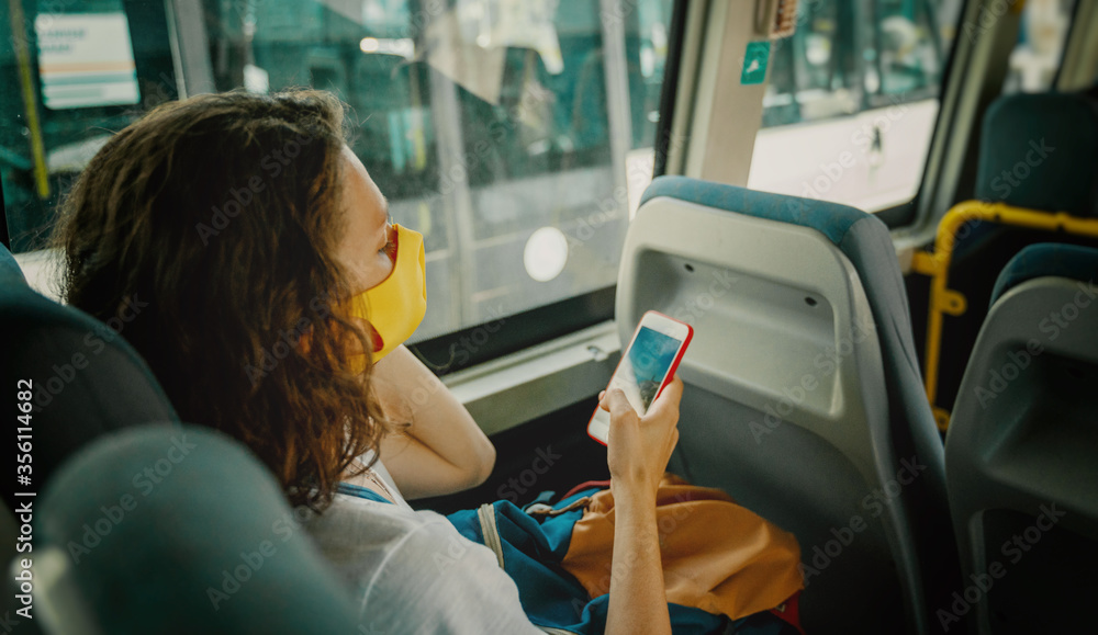 Hipster young girl in a protective mask on her face in a public transport bus with a smartphone in her hands