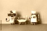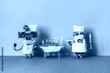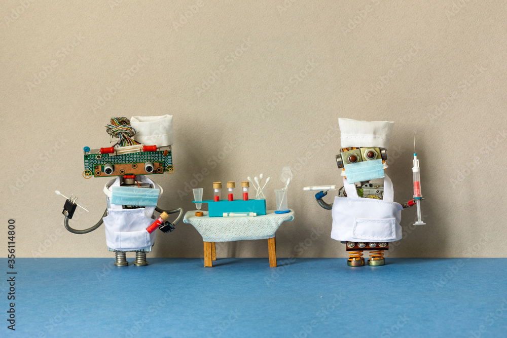 Medic robots holds a test tubes with a patient s blood sample, stick for scraping and Polymerase chain reaction research. Laboratory coronavirus diagnostic. Beige blue background