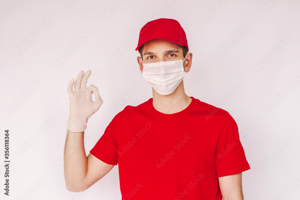 Portrait young happy delivery service courier in medical face mask and protective glove show ok sign isolated on white background. Delivery man in protective face mask and glove gesture okay symbol
