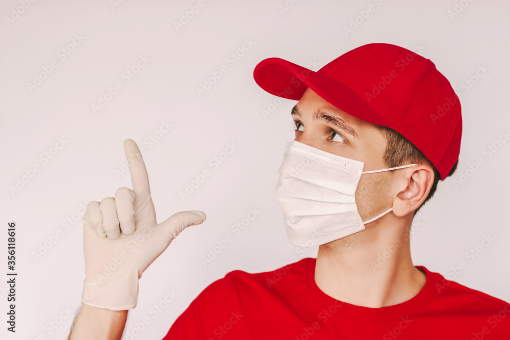 Portrait young man delivery service employee in red cap, protective mask and glove look up, point index finger at copy space on white background. Happy delivery guy in medical face mask. Safe delivery