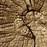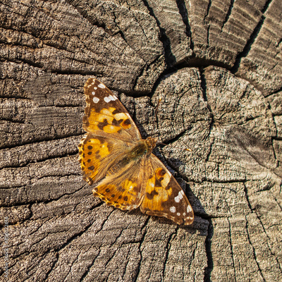 Beautiful agrimony butterfly on a cut of an old log. Vanessa cardui
