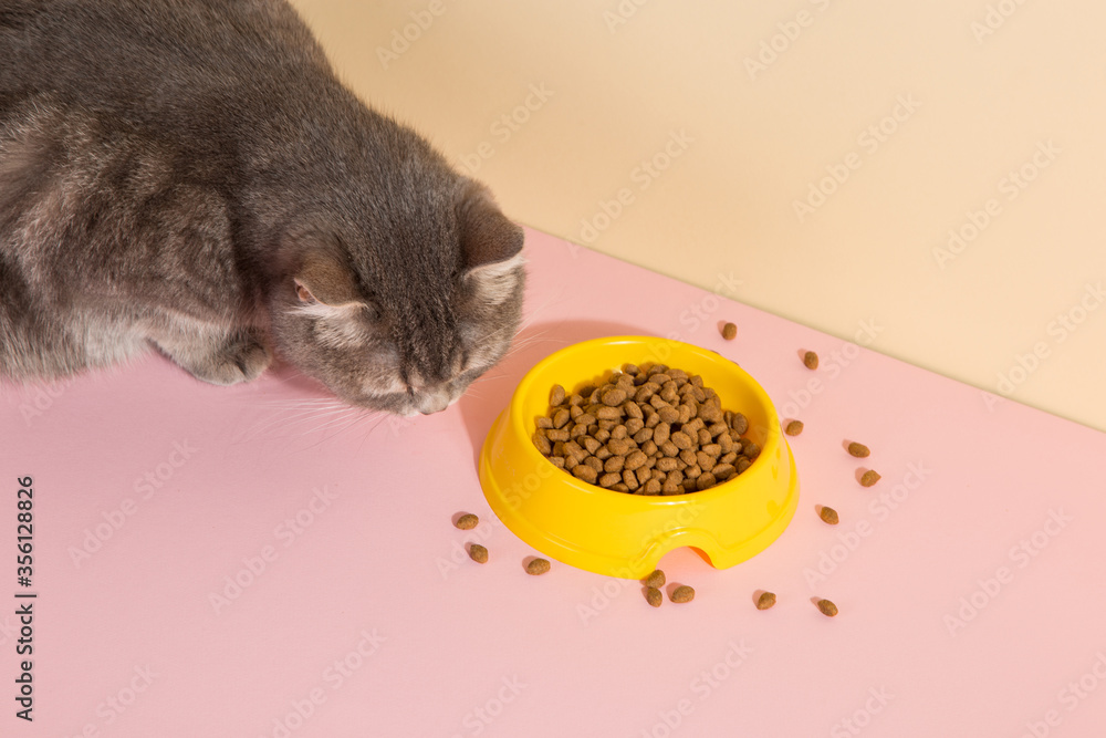 Grey cat and a bowl of food, on colored silk pink background. The concept of food for pets. Copy space.