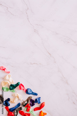 Flat lay of deflated water ballons against a marble background