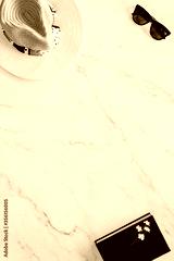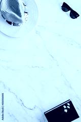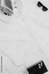 Flat lay of objects related to summer, spring and leisure against a marble background