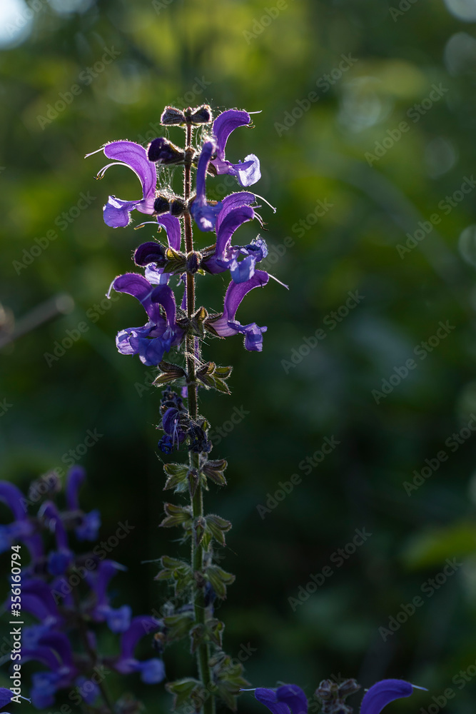 purple flowers of sage in the rays of sunlight. Flowering shrub in the park or garden