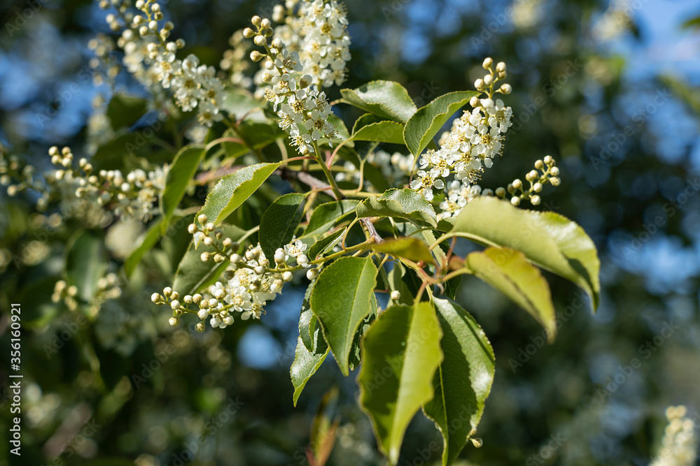 White flowers of bird cherry (Prunus padus, hackberry, hagberry, or Mayday tree), a flowering plant in the Rosaceae family, a species of cherry, deciduous tree or shrub