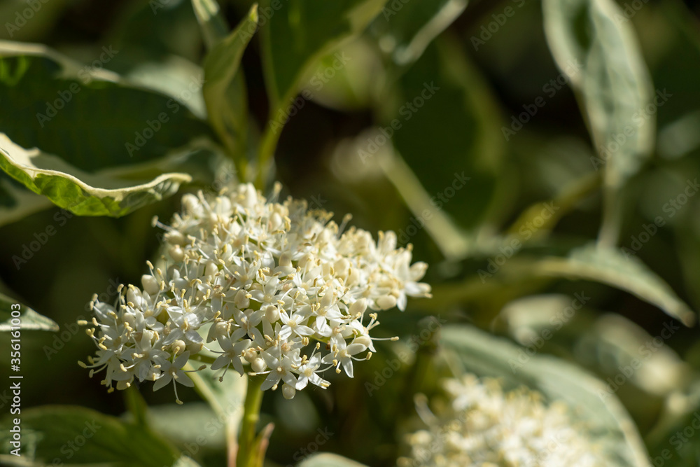 white flowers in the rays of sunlight. Flowering shrub in the park or garden