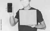 Closeup man delivery service worker in medical face mask, protective glove hold smart phone, cardboard box in hand, empty copy space. Delivery guy carry parcel box, mobile phone, isolated background