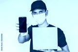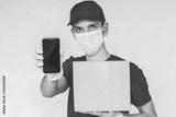 Portrait delivery guy in protective face mask, medical glove carry mobile phone, parcel box in hand, isolated background. Man delivery service courier hold smart phone, cardboard box, empty copy space