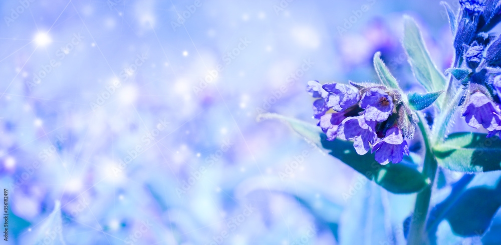 Selective focus. Summer background - Blue flowers Lungwort and Large bee-fly (Bombylius major) drink floral nectar. Classic Blue Template for design.