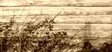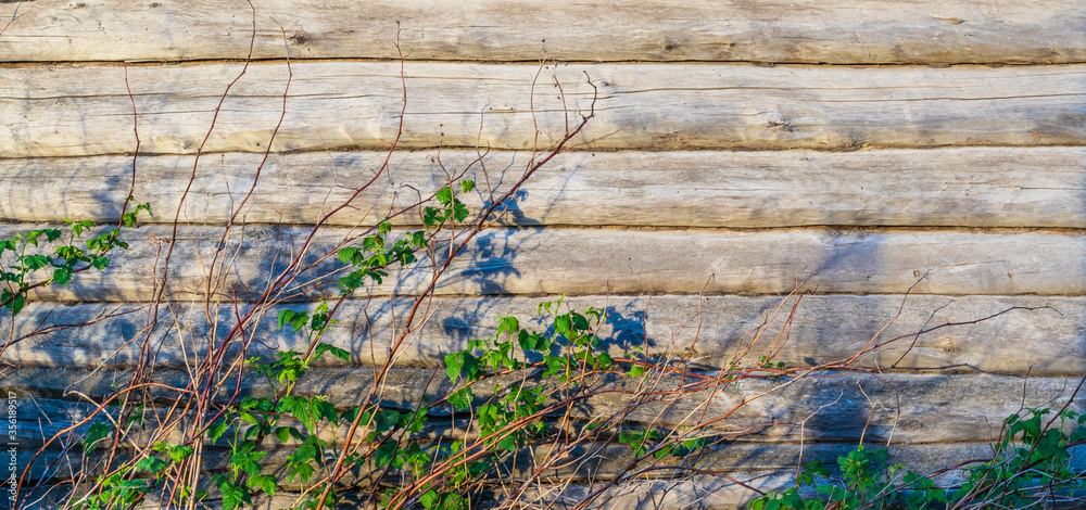 The wall of an old log house. Raspberry bushes Dry twigs and branches with leaves.