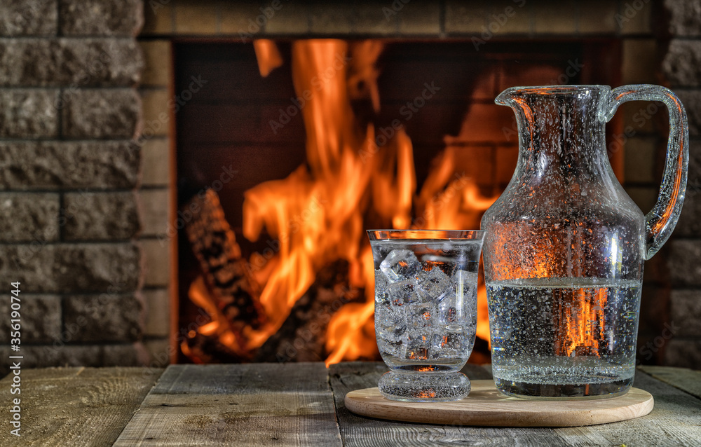 A jar and a glass of mineral water with ice in front of burning fireplace in a country house, copy space.