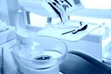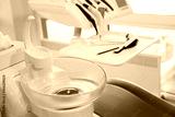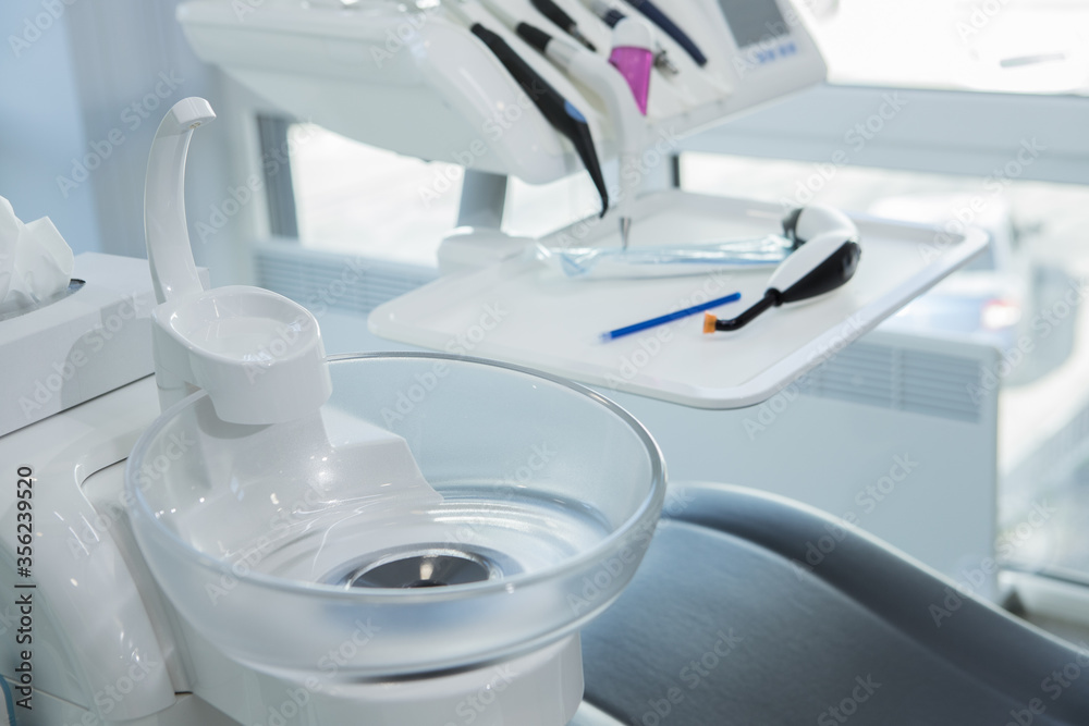Modern dental office without people. Expensive medical equipment. Selective focus. Light, horizontal. Lamp, tap, chair against the background of a window. Close up. Dentistry Design. New technologies.