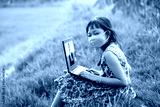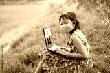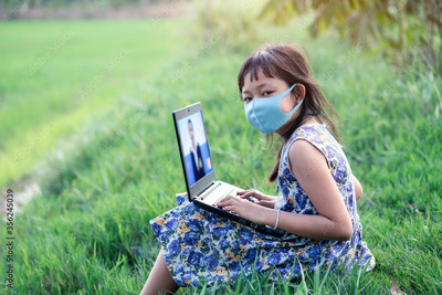 Happy little child girl learning outdoor by studying online and working on laptop in green field with wearing face mask