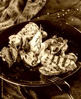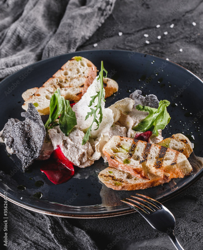 Healthy appetizer with cod liver, ricotta, croutons in a ceramic plate over grey background. Healthy vegan food, clean eating, dieting, closeup