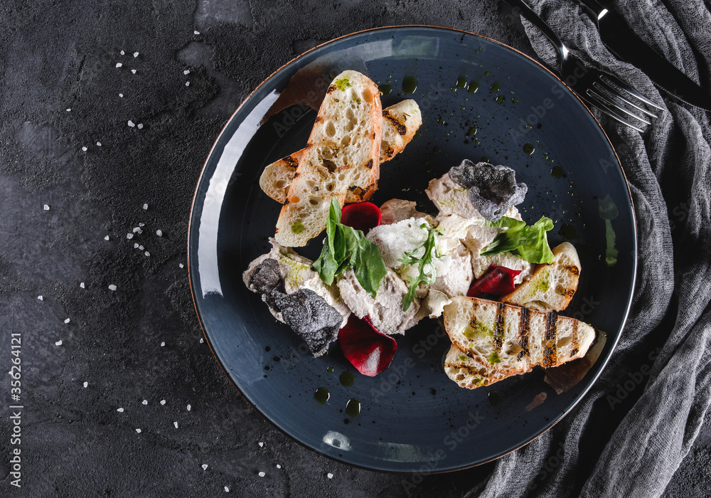 Healthy salad of grilled eggplant, arugula, spinach, tomato, croutons and sauce in a ceramic plate over grey background. Healthy vegan food, clean eating, dieting, top view