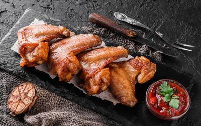 Grilled chicken wings meat with tomato sauce on slate board over dark background. Top view