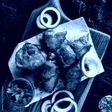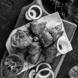 Grilled meat or shish kebab, shashlik with tomato sauce on wooden board over dark stone background. Top view