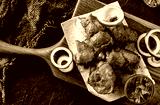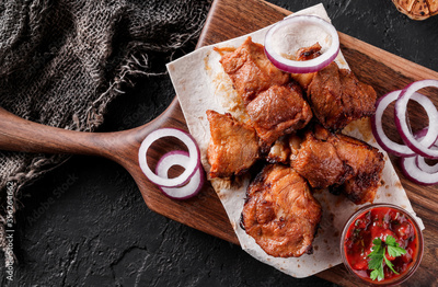Grilled meat or shish kebab, shashlik with tomato sauce on wooden board over dark stone background. Top view