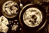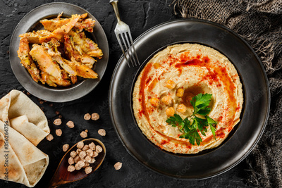 Chickpeas hummus with chicken meat, olive oil, paprika in a plate over dark stone background. Healthy food, top view