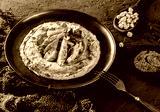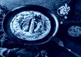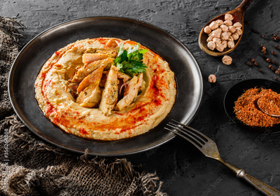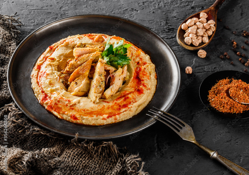 Chickpeas hummus with chicken meat, olive oil, paprika in a plate over dark stone background. Healthy food, close up