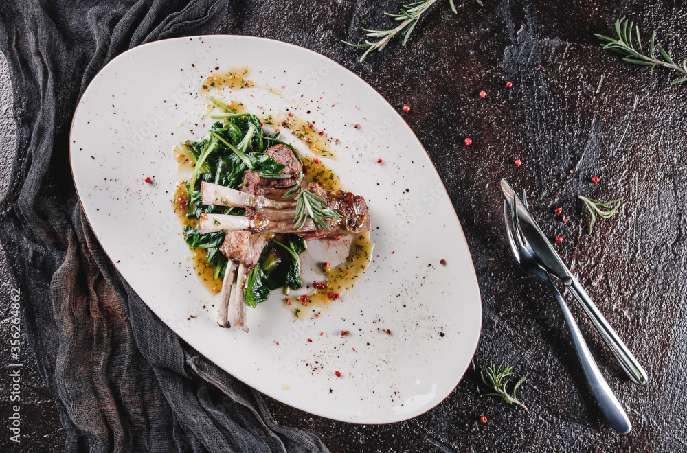 Roasted tomahawk rib beef steak on bone with braised spinach and sauce in ceramic plate over dark background. Hot Meat Dishes, high protein dinner, top view