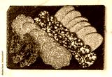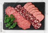 Antipasto platter cold meat with prosciutto, sausage, salami on slate stone board over marble background. Meat appetizer