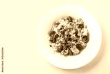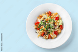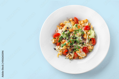 Caesar salad with lettuce, tomatoes, sprouts, croutons and sauce in plate on isolated blue background. Healthy food, vegetarian dieting, top view