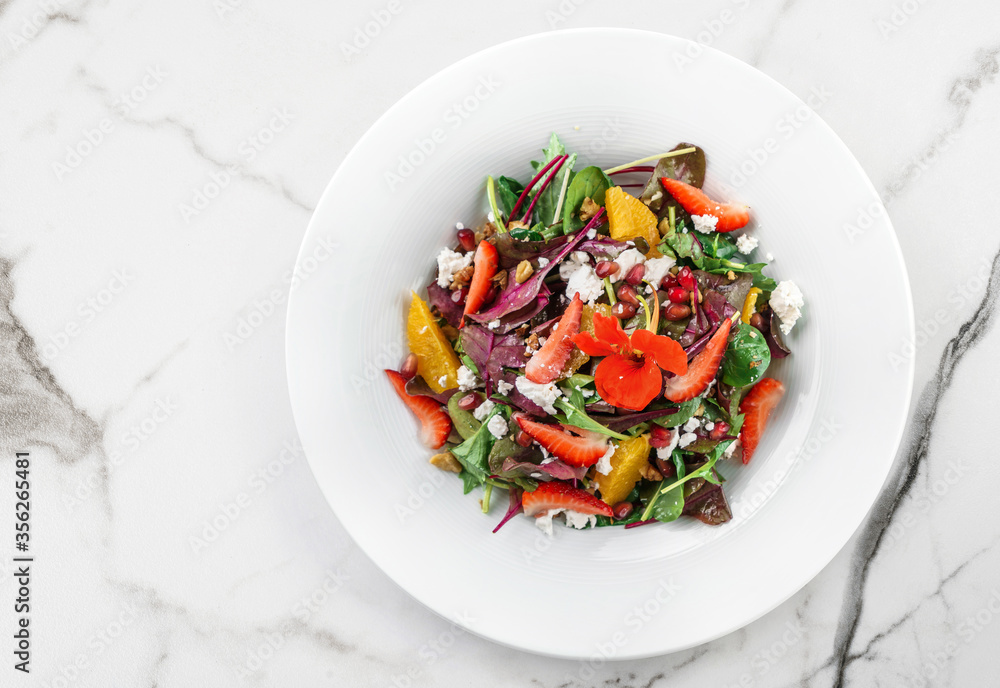 Healthy fresh salad with mix greens, strawberry, orange, nuts, cream cheese and edible flowers in plate on light marble background. Healthy food, vegetarian dieting, top view