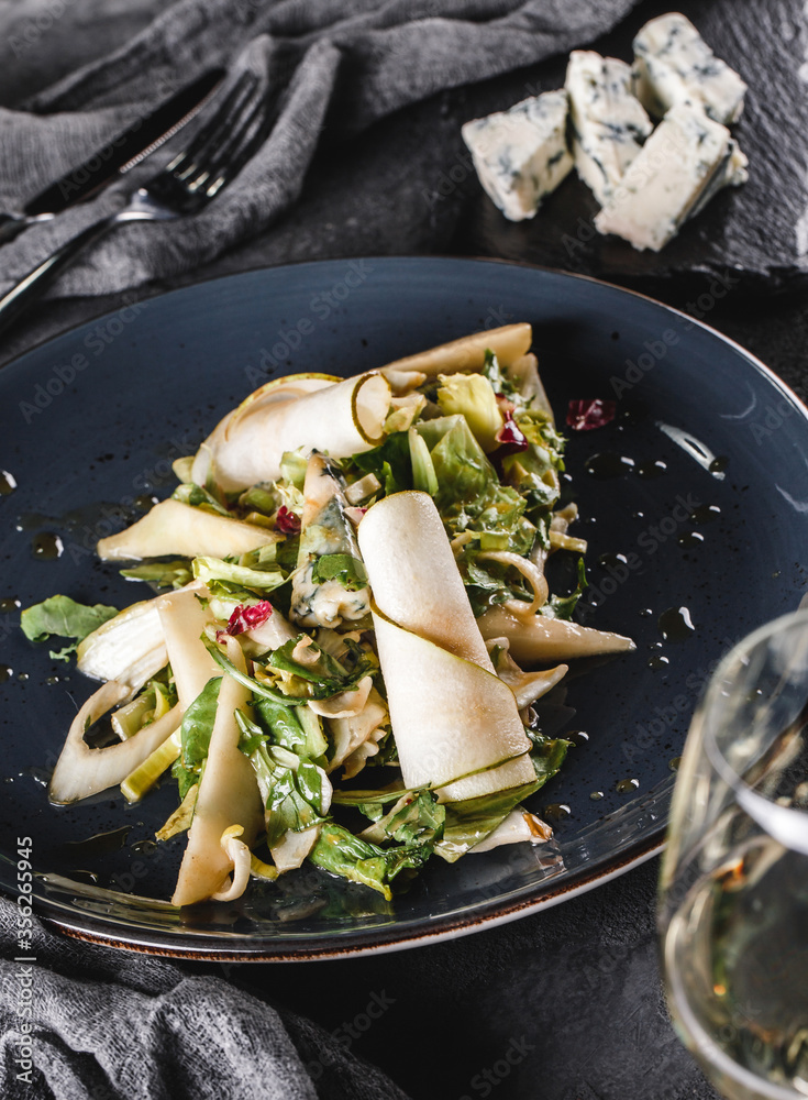 Mixed salad with pear, cheese gorgonzola and sea buckthorn sauce in a ceramic plate over grey background. Healthy vegan food, clean eating, dieting, top view