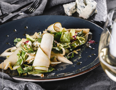 Mixed salad with pear, cheese gorgonzola and sea buckthorn sauce in a ceramic plate over grey background. Healthy vegan food, clean eating, dieting, top view