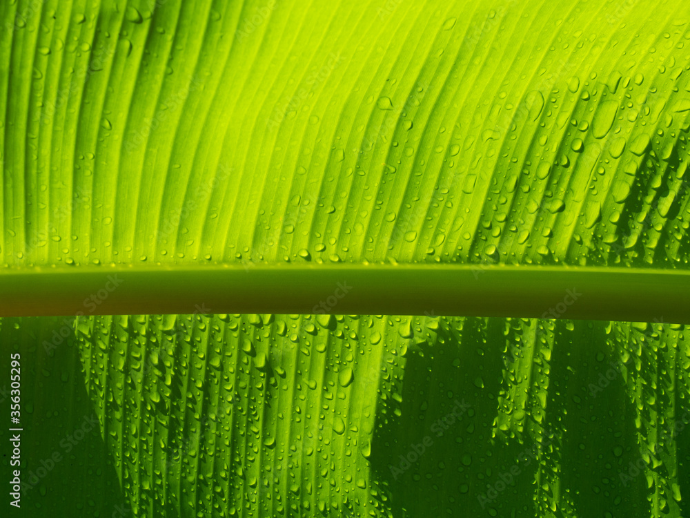 Water drops on green banana leaf, Texture for add text or graphic design , Freshness of plants after rain fall