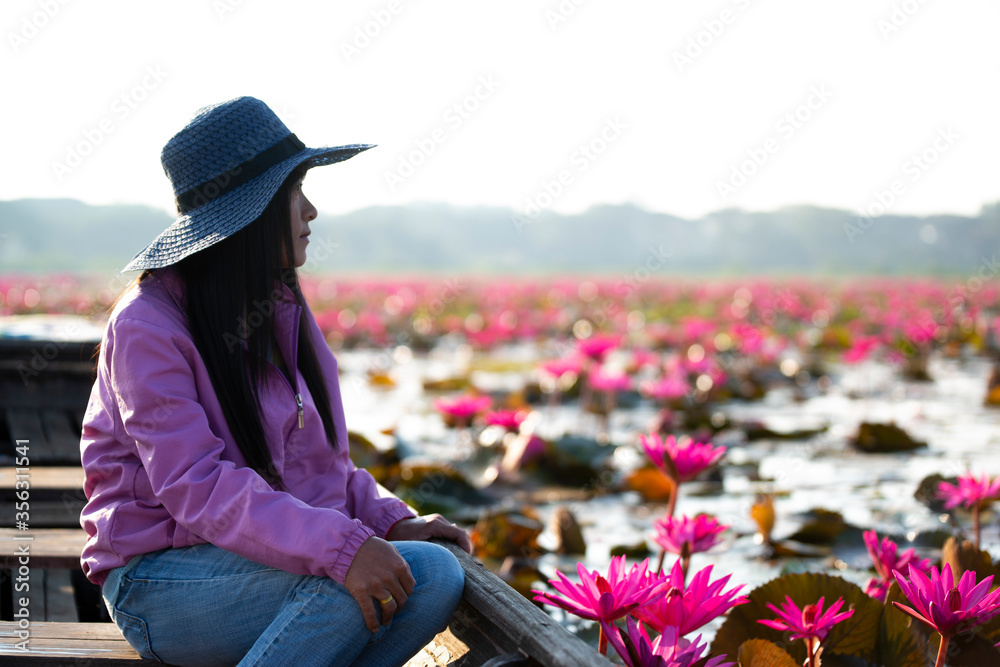 beautiful asian woman Take a boat to admire the beauty Landscape red Lotus in the morning background,At a lake in Phayao Province of Thailand