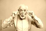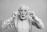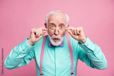 Closeup photo of excited crazy attractive grandpa open mouth listen good news astonished taking off specs wear mint shirt suspenders bow tie isolated pastel pink color background
