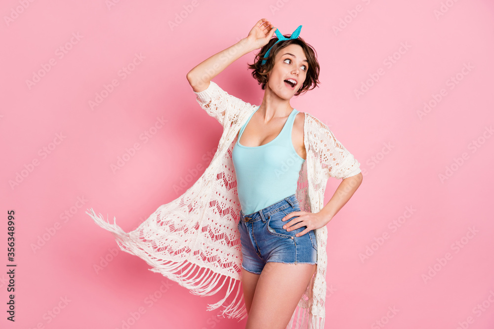 Portrait of her she nice attractive lovely fashionable charming pretty cheerful cheery girl air wind blowing looking back enjoying isolated over pink pastel color background