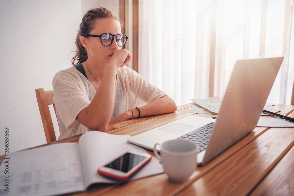 Serious young woman in glasses sits at a table in front of a laptop screen, remote work burnout.