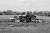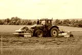 Big red tractor with two mowers mows the grass for silage