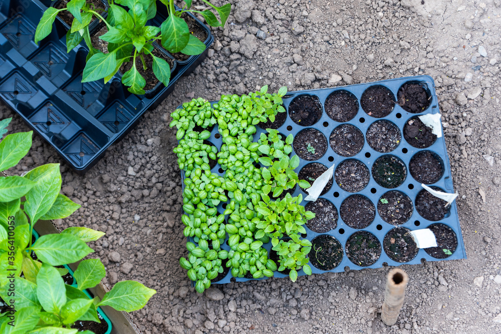 Young plants growing out of soil on the field