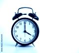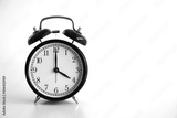 Black vintage alarm clock on table. White background. An image of a retro clock showing 04:00 pm/am.