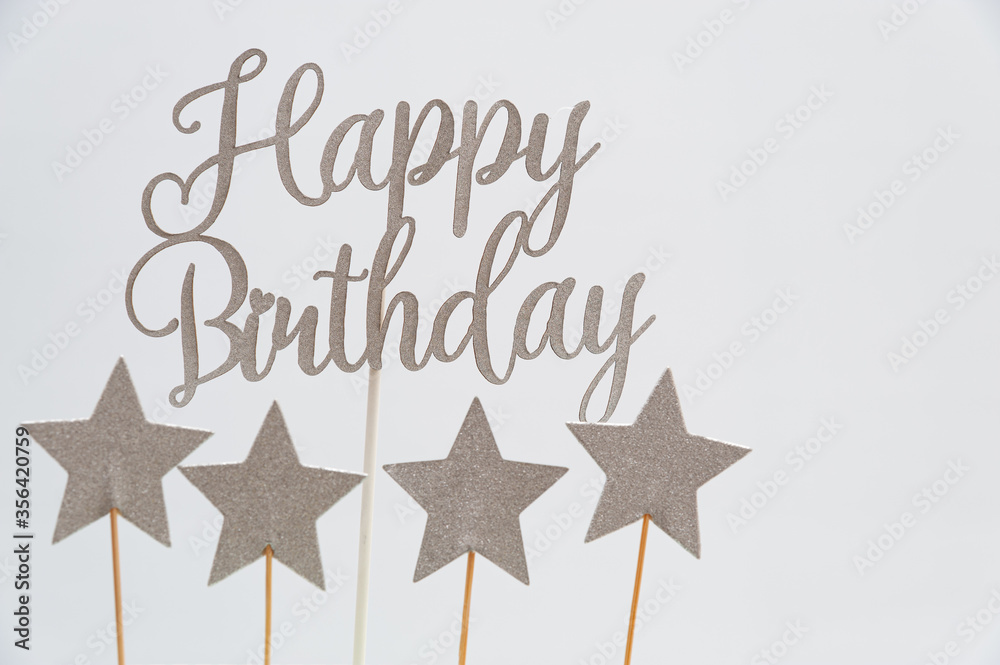 Happy Birthday written in silver letters with star shapes. Isolated on white background. Copy space.