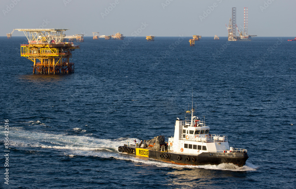 Oil rigs and a transportation vessel in the South China Sea