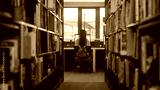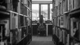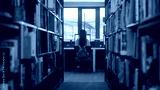 University Library: Focused Bright Student Working on Personal Computer, Doing Research on Class Assignment, Study Her Subject, Writing Papers. Back View Shot Between Rows of Bookshelves