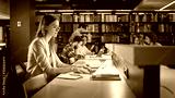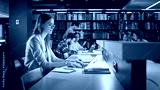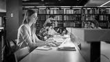 University Library: Talented Caucasian Girl Sitting at the Desk, Uses Laptop, Writes Notes for the Paper, Essay, Study for Class Assignment. Diverse Group of Students Learning, Studying for Exams.