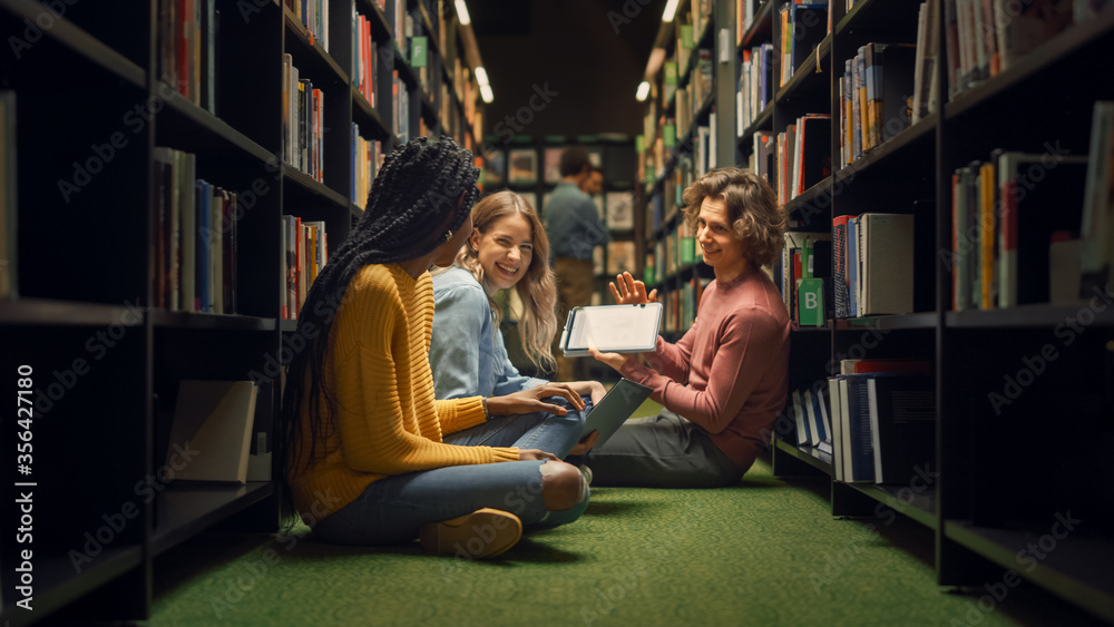 University Library: Diverse Group of Students Sitting Cross-Legged On the Floor, Talk, Use Digital Tablet Computer, Share Screen, Have Fun, Discuss Paper, Study and Prepare for Exams Together