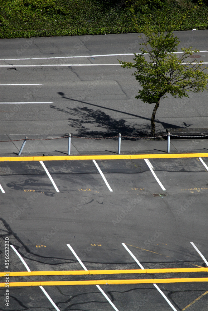 Abstract aerial shots of parking lot with white and yellow stripes and signs
