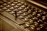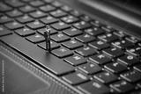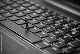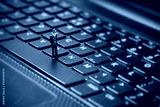 Miniature policemen inspecting laptop. Piracy and internet web hacking concept