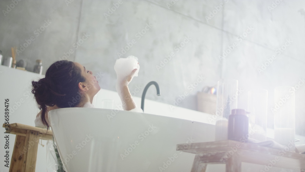 Close up cheerful woman blowing foam in light bathroo imn slow motion.