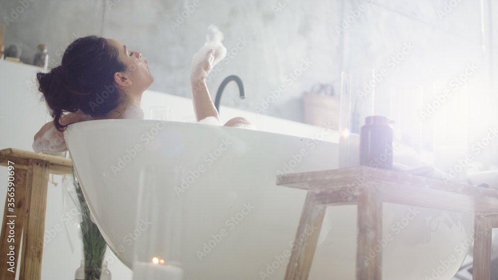 Close up sensual woman blowing foam. Smiling girl having fun with foam in bath.