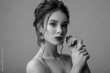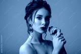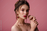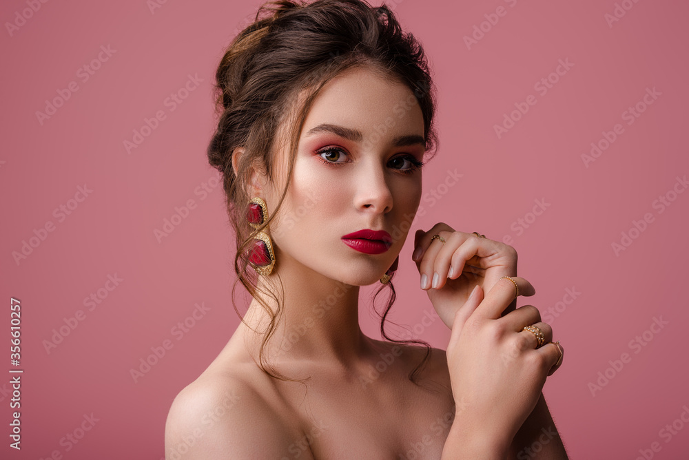 Beauty, fashion portrait of young beautiful woman with pink, fuchsia color eyes, lips makeup, wearing big trendy earrings, many rings, posing on pink background.