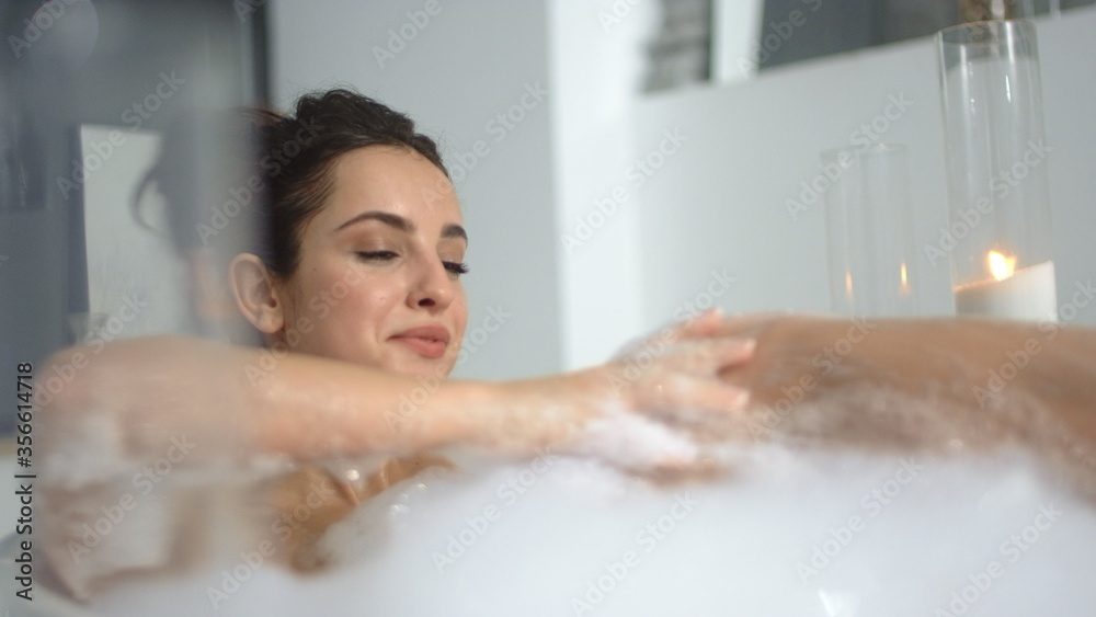 Close up hot woman lying in foam at bathroom. Sexy girl relaxing at luxury bath.
